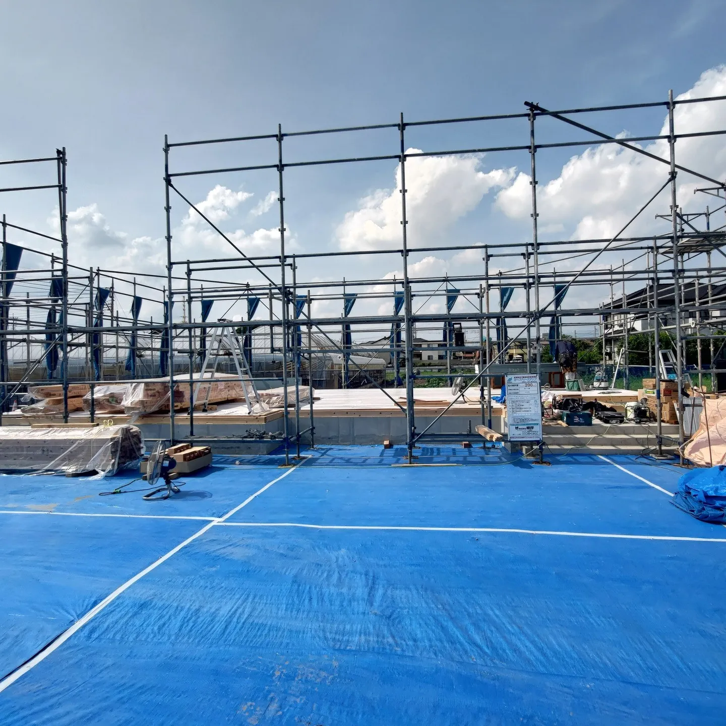 暑い中、建て方の準備中! 体調管理もだいじな仕事です。職人さんには感謝しかありません!